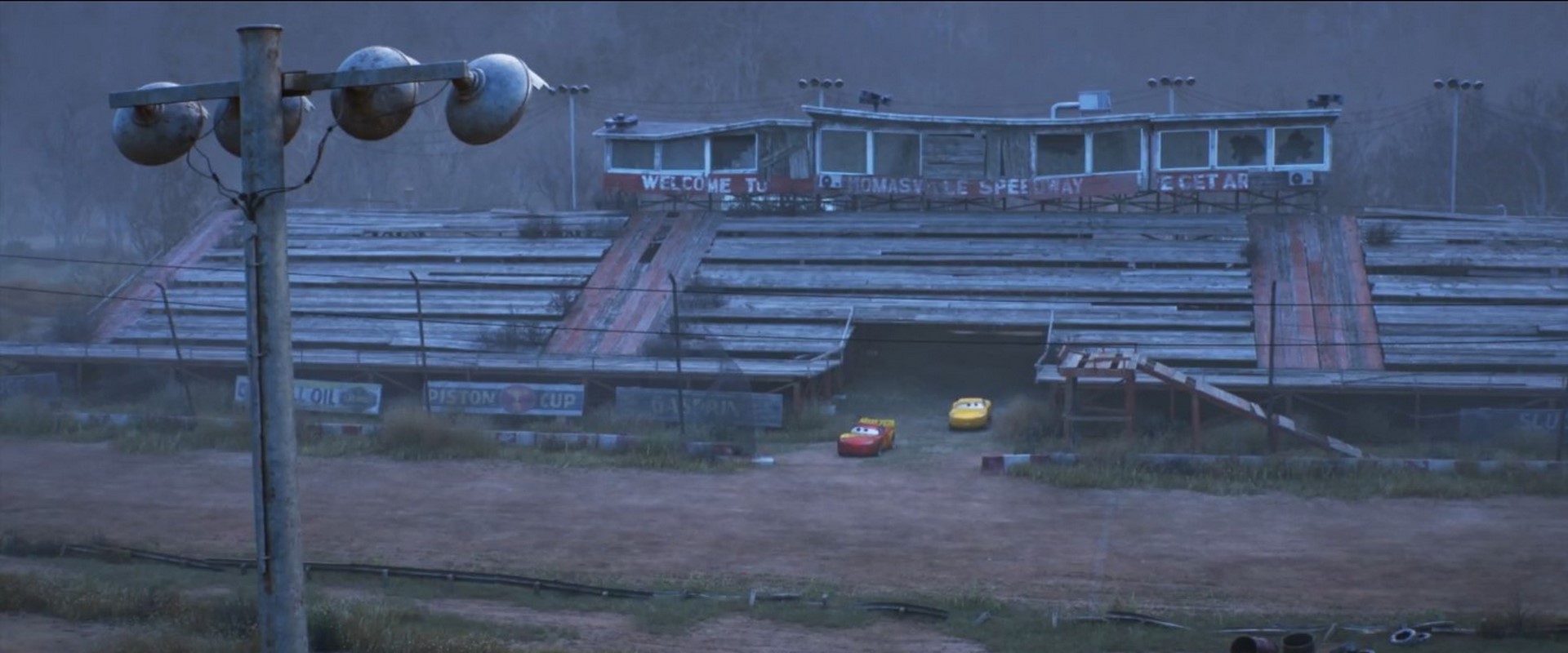 - When Lightning, Bobby and Cal enter the pits, the camera shows a slight view of the trailer parking lot, and Lightning's trailer has its paint job from after his crash at the Los Angeles 500.