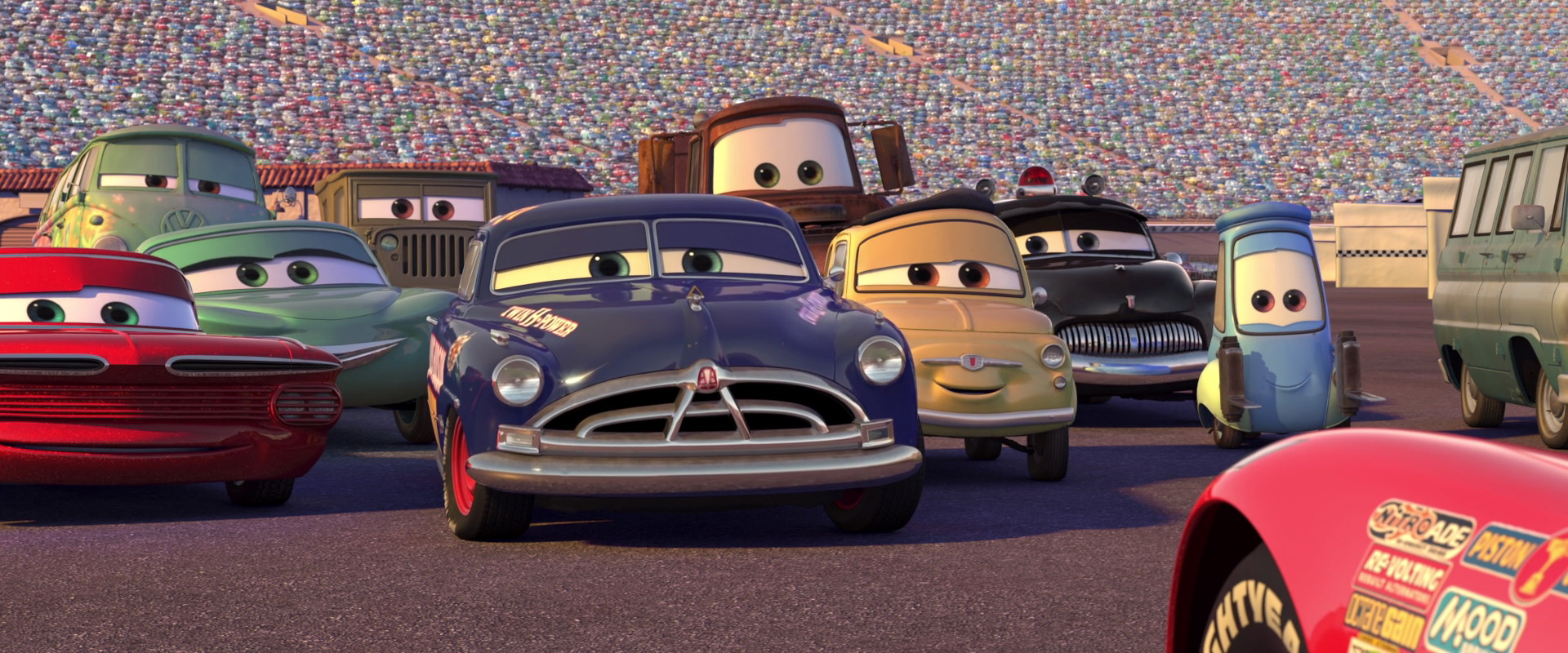 Later in the story, Doc challenges Lightning, Fillmore, Ramone, and Sheriff to a race around the back roads of Radiator Springs, as a check-up of sorts. At Lightning's fourth Piston Cup race, the Smasherville International Speedway event, when Lightning confronts Chick for stealing his gear, Doc separates the two and tells McQueen to save their conflict for the track.