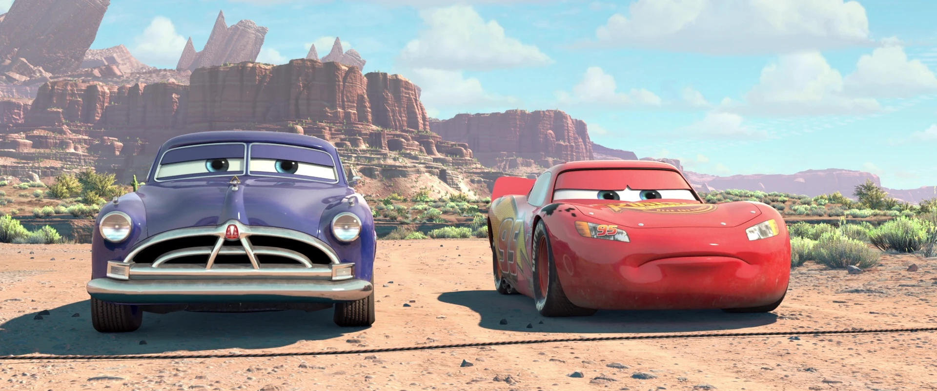 Bored and frustrated with the task, Lightning decides to rush it, and finishes the road within an hour as told by Mater. However, when word spreads to Doc, he discovers that the road is far from smooth, and is nothing but a mess of asphalt. After the residents confront Lightning, his cocky response inspires Doc to challenge him to a dirt track race. As the Radiator Springs townsfolk are unaware of Doc's past, they are surprised to see him up for a racing challenge.