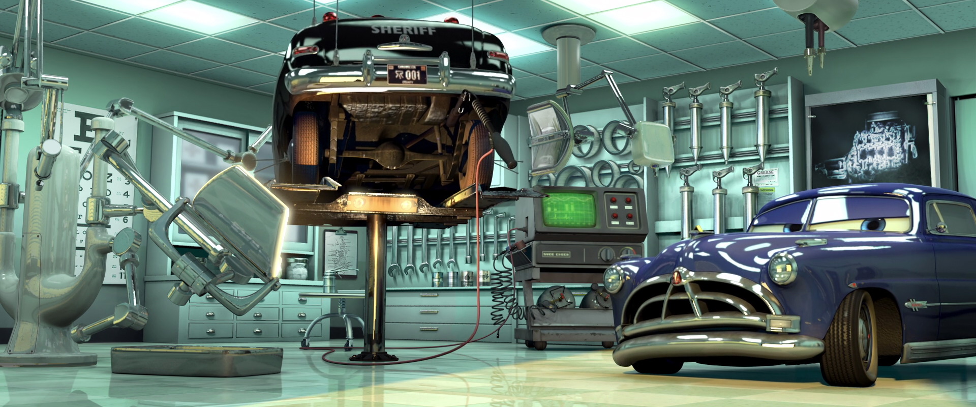 At the Rust-eze Racing Center, Doc's photo and history appears on the one of walls with McQueen's memorabilia.
