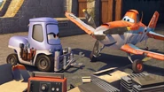 However, during that night, Dusty flies out defiantly to test his limits while having Dottie's warning light installed, only to have trouble landing, before hitting the tower of the Fill n' Fly, causing a part of the building's roof to fall onto a fuel dispenser and start a fire. Noticing this, Dottie works with the rest of the residents to help put it out. Eventually, the plan works by toppling the water tower, but the airport is soon closed by Ryker, a member of the Transportation Management Safety Team, who sees that the town does not have any plans for an emergency, and will only reopen it if Mayday, the town's fire truck, hires another firefighter.