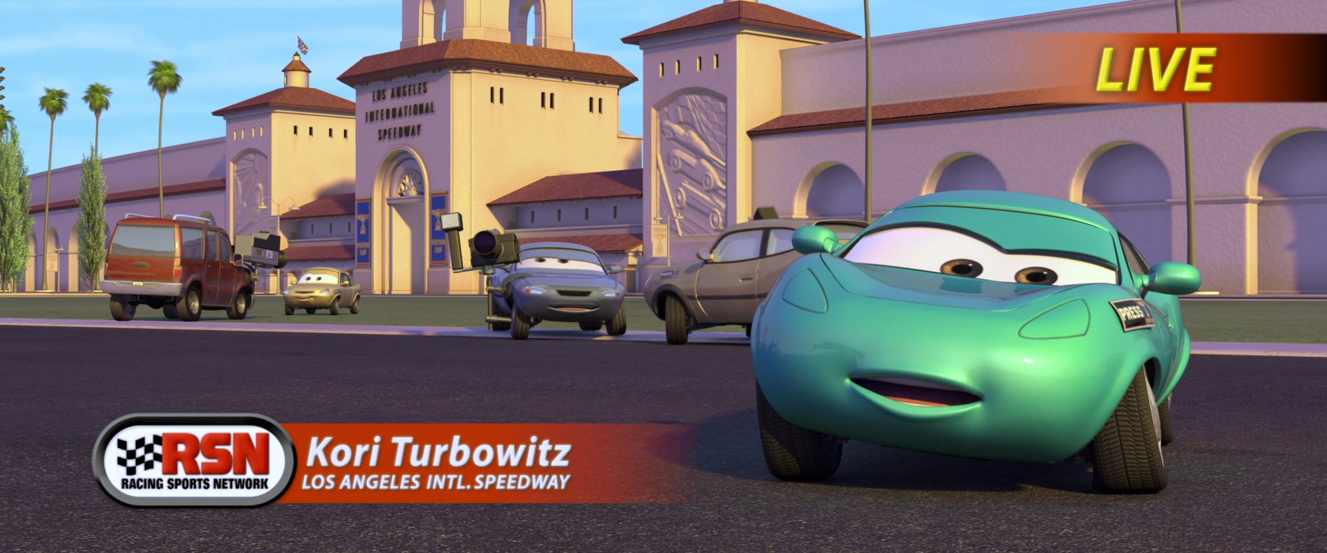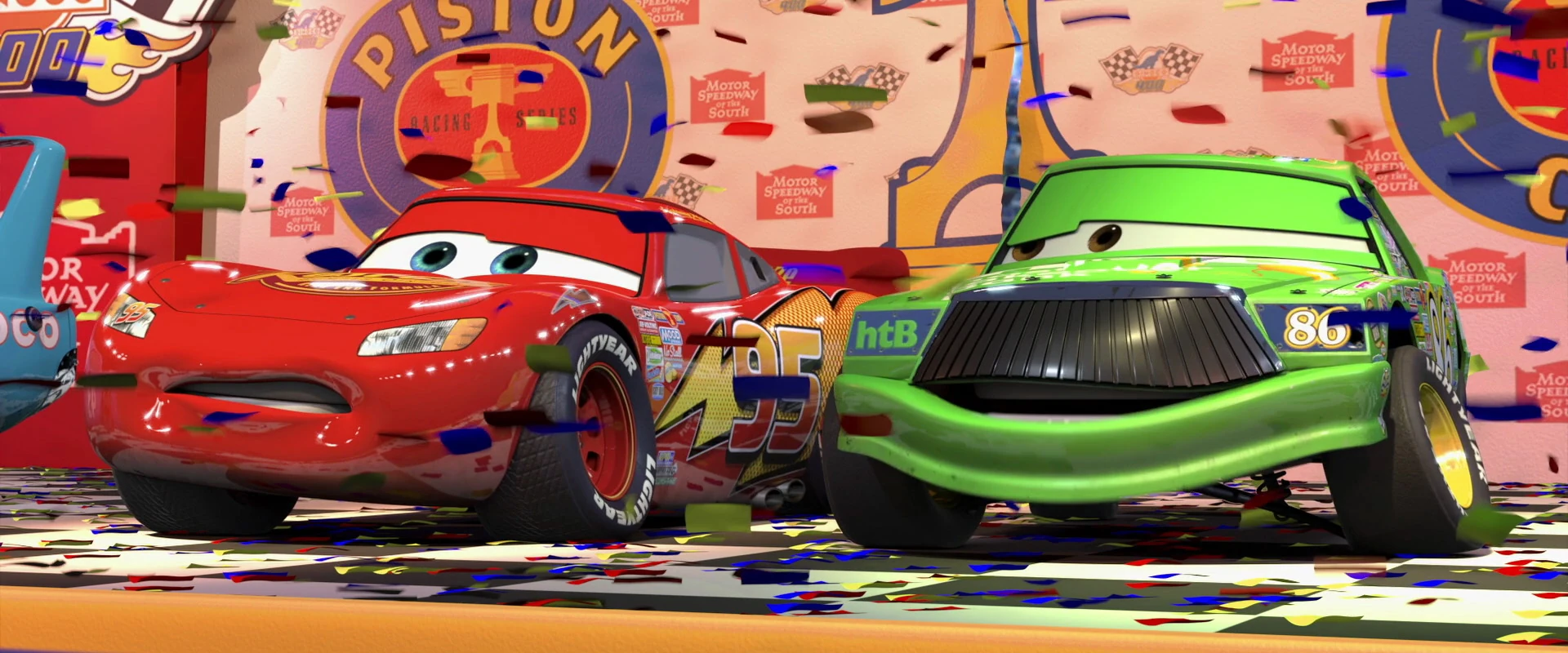 In Cars, after Lightning McQueen, Chick Hicks, and The King tie during the Dinoco 400 at the Motor Speedway of the South, a tie-breaker race to determine the 2005 season winner is set to be held at the Los Angeles International Speedway. While sitting on the winner's podium, Hicks makes a bet with McQueen in which the first of the two to reach the speedway will be the one to win the Dinoco sponsorship.
