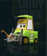 Shiny Wax, also seen as Waxy Wax, is a wax trademark. This product gives the cars a nice and shiny coat of wax that makes them look brighter and waxier. Darren Leadfoot and Conrad Camber are the proud bearers of this sponsor for the Piston Cup races. Their team number is 82.