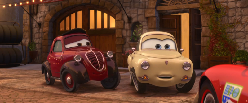 In Cars 2, Uncle Topolino and Mama Topolino greet the members of Team McQueen, who are staying with them while awaiting the second World Grand Prix race, which happens to take place in Porto Corsa. When McQueen is feeling bad about yelling at Mater, Uncle Topolino gives him words of wisdom, explaining about how Luigi and Guido used to constantly get into arguments, but in the end, they would always make up and resolve their problems. He then strolls off with Mama Topolino.